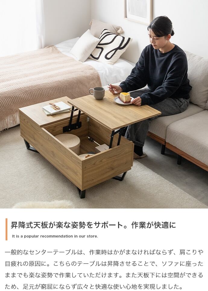 これ一台で暮らしのあらゆるシーンに対応する『Reveur(レヴール)』昇降式引き出し付きセンターテーブル。天板がスッと引き寄せられ、食事やメイク、読書やちょっとした作業も快適に行っていただけます。天板下収納と引き出しにはリビングの小物をすっきりまとめられるため、いつも整った空間に。直線的なフォルムとブラックスチール脚が、上質な洗練された空間作りを叶えます。