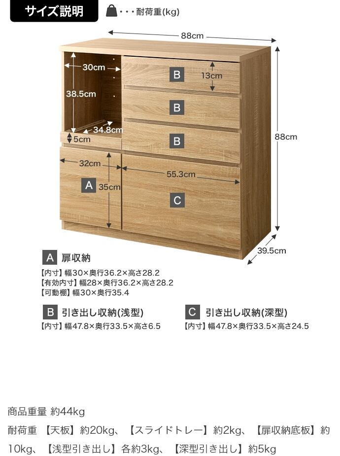浅型引き出し:各約3kg、深型引き出し:約5kg