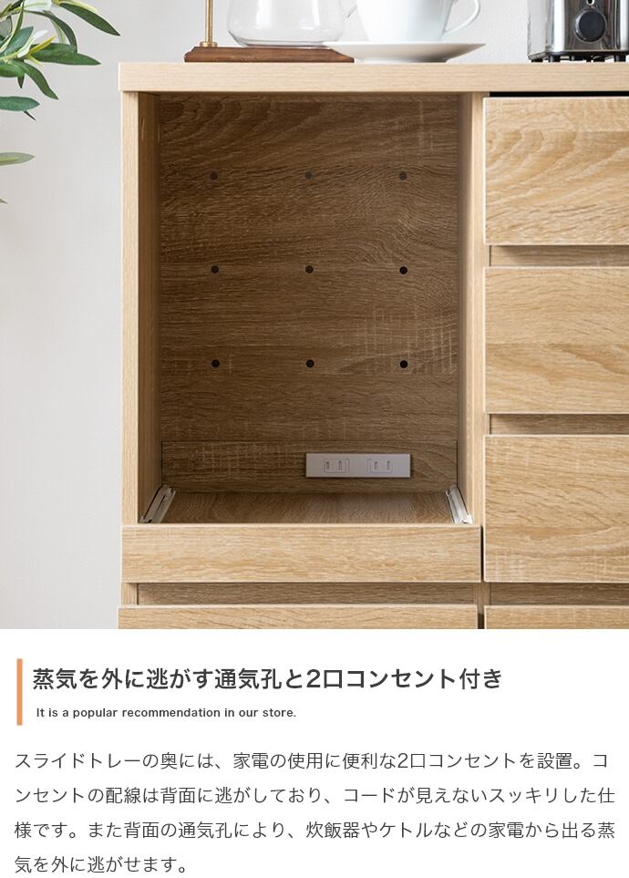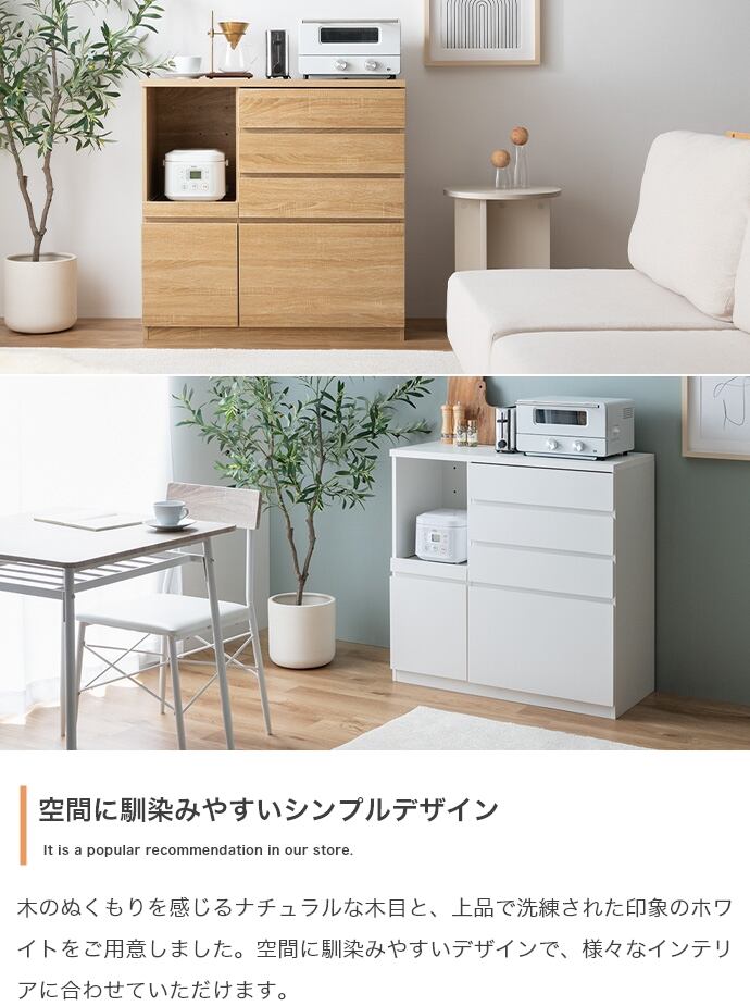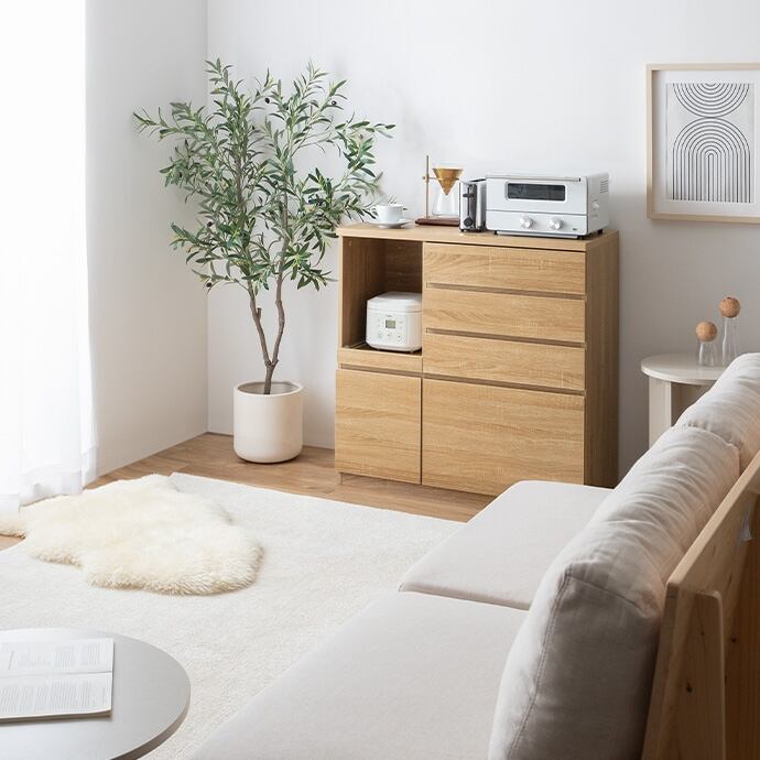 たっぷり収納でキッチン空間が整う『Foggi(フォッジ)』レンジ台。コンパクトながら4杯の引き出し、オープン収納、扉収納を備え、充実した収納力を実現しました。たっぷりお皿やお鍋を収納でき、キッチン周りの様々なものをこの1台にまとめて収納していただけます。また天板はカウンターとしても使えるため、調理時の作業台としてもぴったり。省スペースで置きやすいサイズ感なので、ワンルームや一人暮らしの方にもおすすめのレンジ台です。