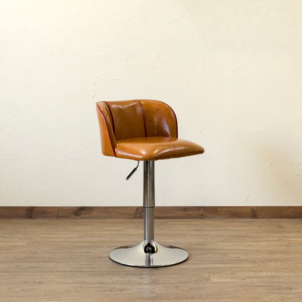 アンティーク感のあるPUレザー張りです。パイピング部分はアクセントで張り地と別な色になっています。背もたれ部分は腰を包み込むように半円になっています。座面は360度、回転します(固定出来ません)。レバー操作で約15cm昇降可能です。