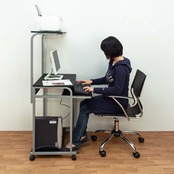 プリンターなどは上段の棚に、キーボードはスライドテーブルに、小物やソフトは下段の棚などに収納できます。奥行きも45cmと薄いので狭い場所にもすっきり置けます。移動に便利なキャスター付きです。前輪2ヶはストッパーも付いています。