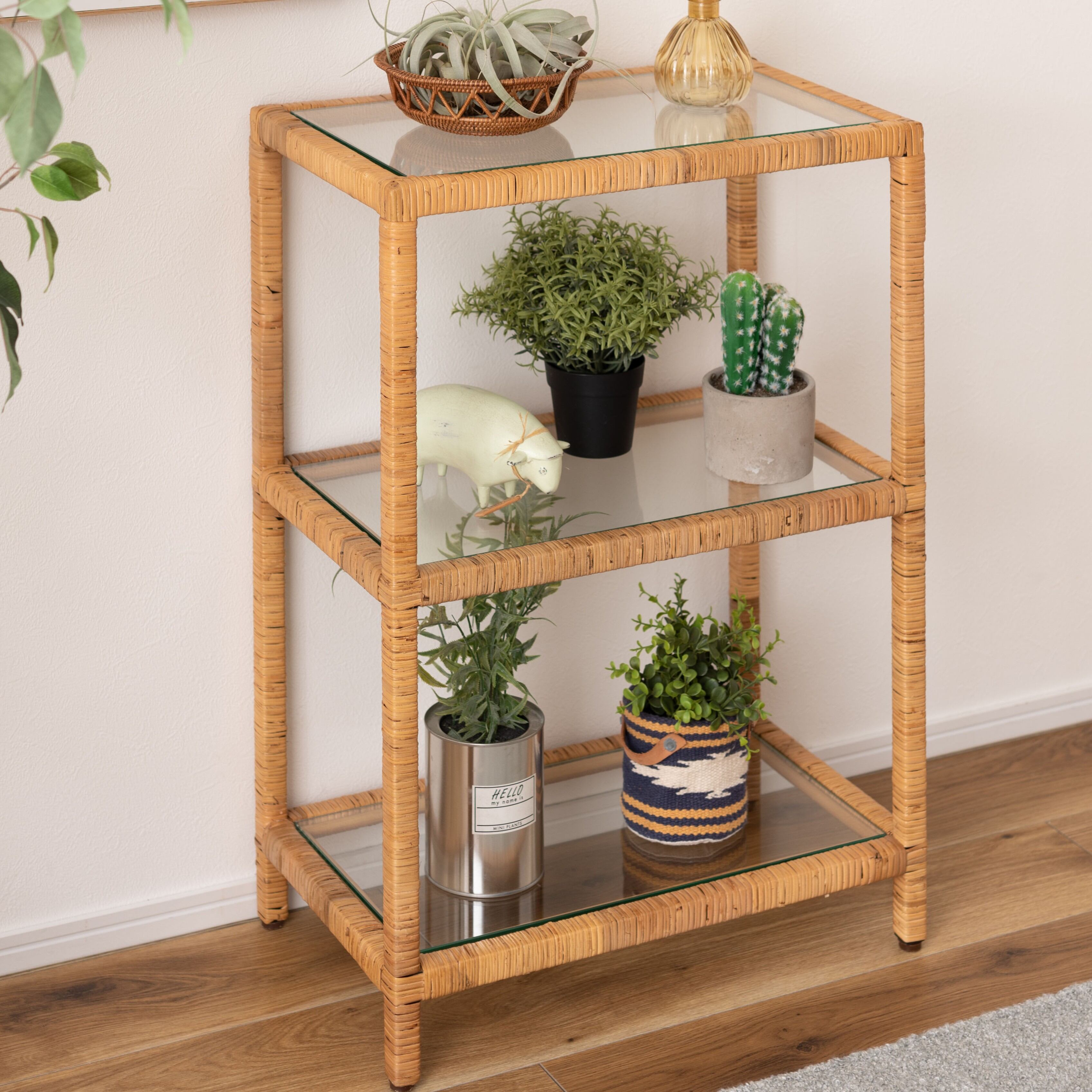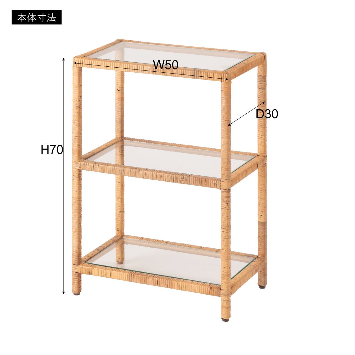 【検索キーワード】シェルフ ガラス ガラスシェルフ ラタン 籐 クリア 収納 収納棚 ラック オープンラック 3段 三段 見せる収納 シンプル 北欧 ナチュラル ナイトテーブル 強化ガラス