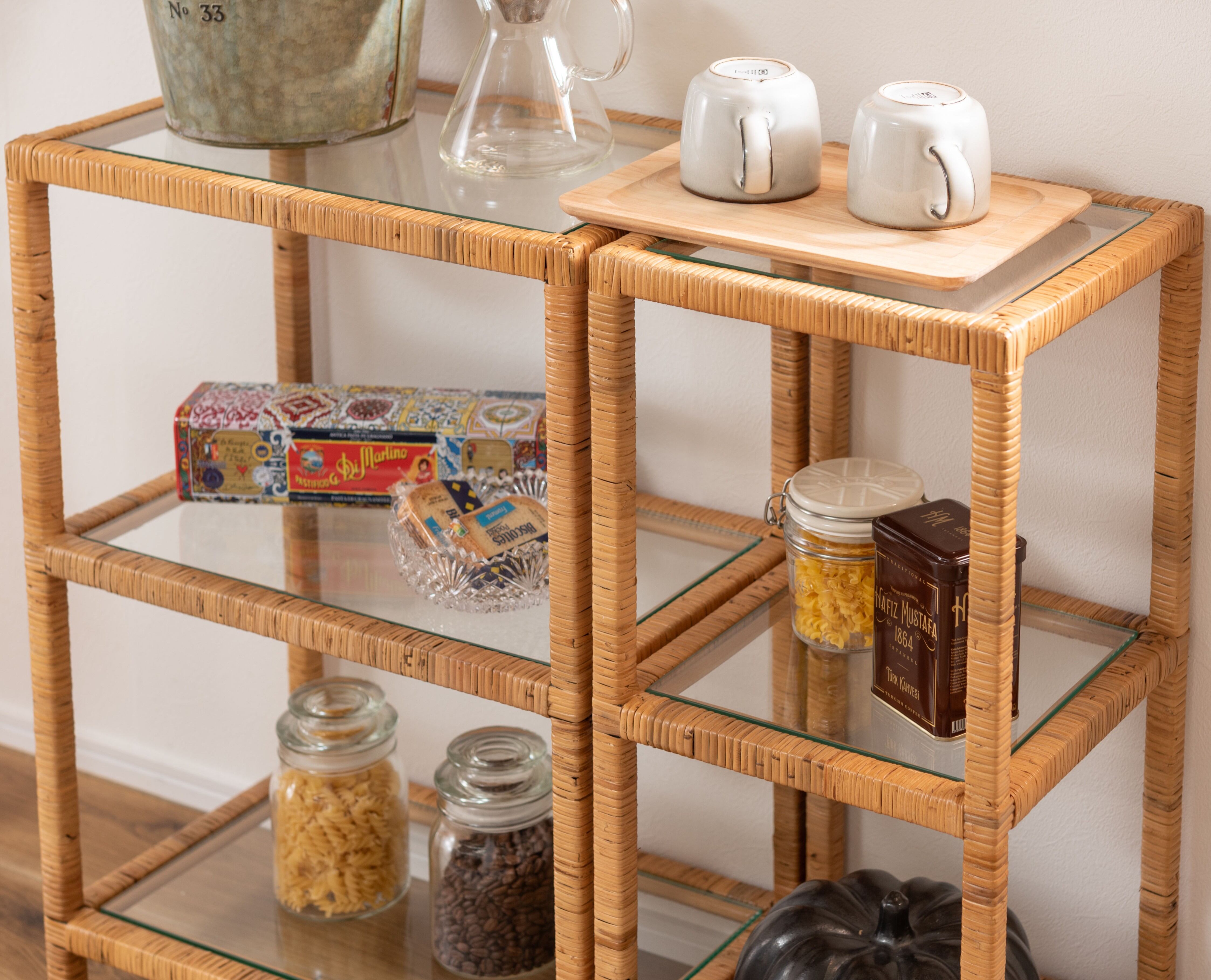●透明感が美しい取り外し可能なガラス、スチールフレームに巻いた天然ラタンの相性がぴったりなガラスシェルフです。