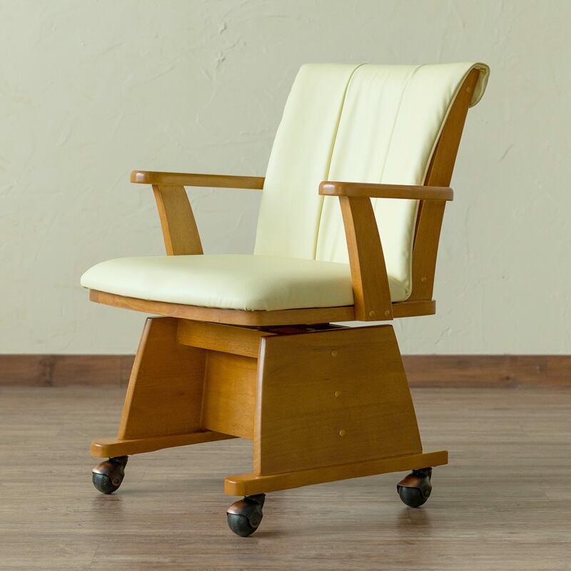 NEW キャスター付き回転式チェア ダイニングチェア PVCレザー 肘付 天然木フレーム