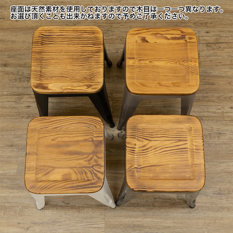 座面は天然木素材を使用しています。木目は一つ一つ異なります。木目の色味を濃く、目を惹くように表面は焼き付け加工仕上げとなっています。
