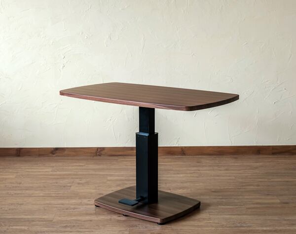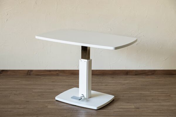 脚元のペダルを踏んで昇降するテーブルです。T字脚で見た目もすっきりして、足元が広く邪魔になりません。