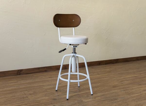 座面は360度回転します(固定されません)。座面の張り材はお手入れし易いPVCです。背もたれは強度の強い積層合板(ウォールナット突き板張り)です。足元は足が置ける仕様になっています。