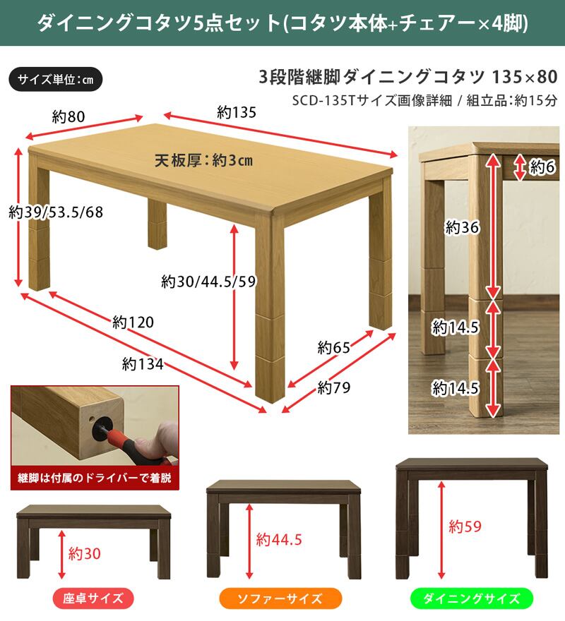 3段階継脚ダイニングコタツ 135×80 センターテーブル ローテーブル ちゃぶ台