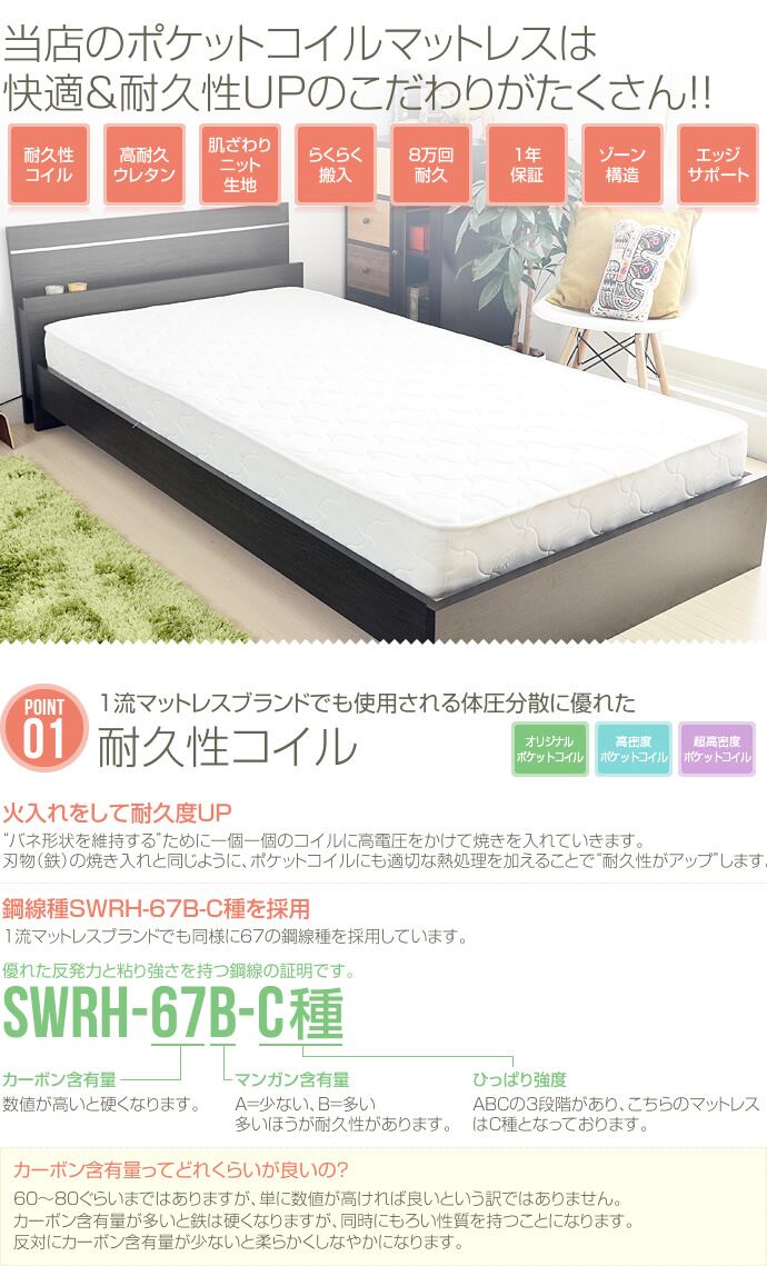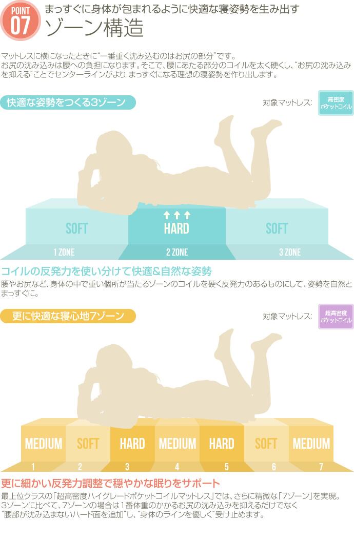 快眠ベッド マットレス。ポケットコイルマットレスは1つ1つのコイルが“点で体を支える”ので、しなやかな寝心地を体感できます。身体のラインにフィットし、マットレスにかかる“耐圧を分散”しますので“横揺れが少ない”のが特徴のベッド マットレスです。また、「8万回」の過酷な耐久テストをクリアした、安心の品質は、あらゆる世代の方へ快適な睡眠を実現いたしました。【セミダブルサイズ】