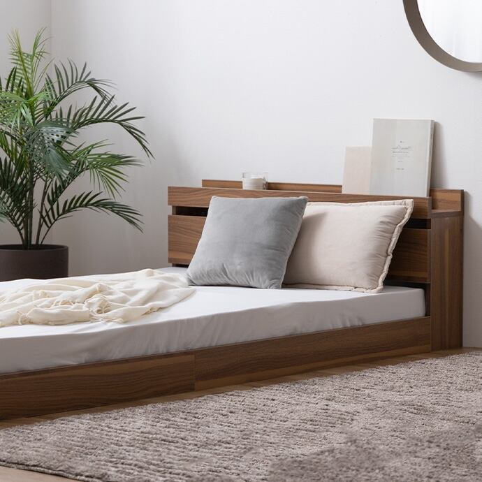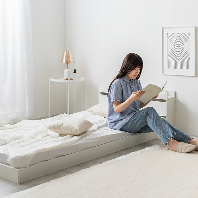 圧迫感がなくお部屋を広く魅せることが出来る『Coroa(コロア)』シリーズのフロアベッド。ベッドの高さを低くするロースタイル設計で、窮屈になりがちな寝室もゆとりある空間になります。ヘッドボードにはスマホや眼鏡などを置くのに便利な宮棚付きです。