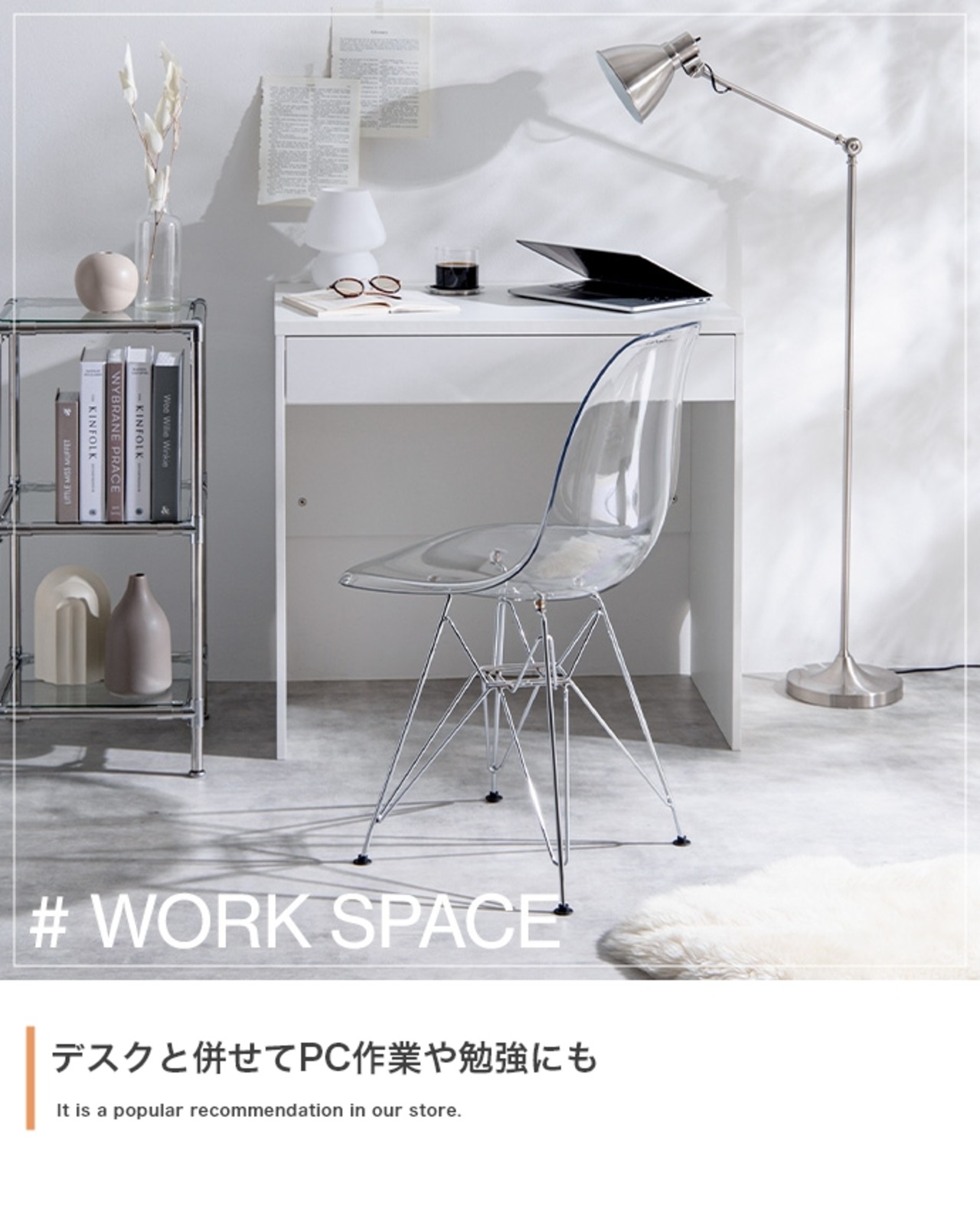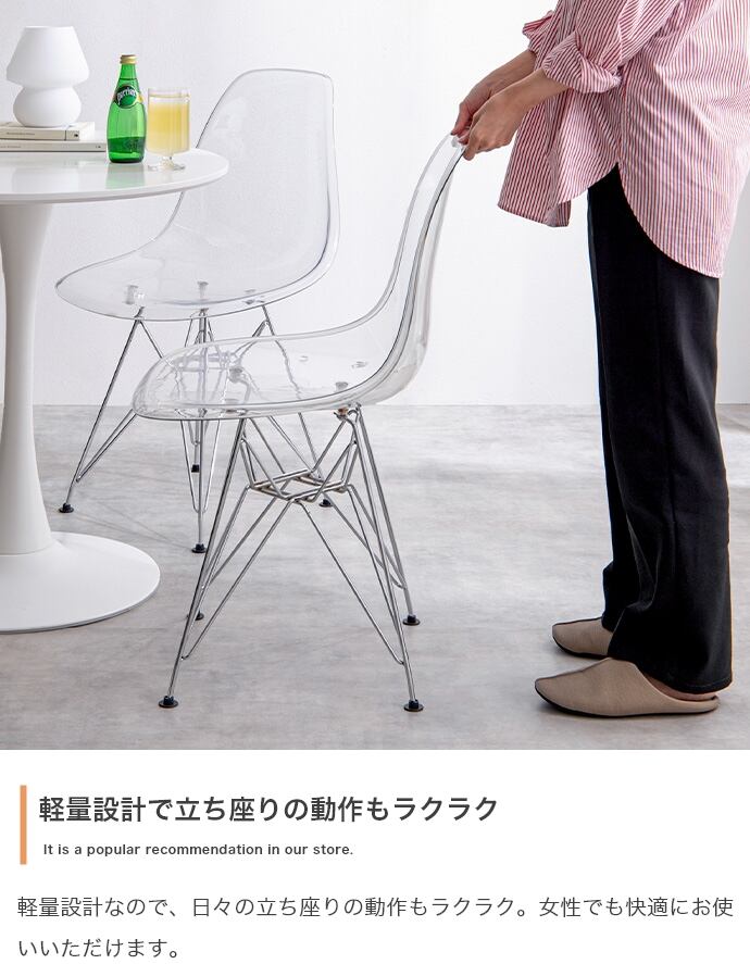 透明感が高く美しい座面と、線の細い脚部の組み合わせが印象的な『Eames DSR』イームズサイドシェルチェア。透明感あふれるガラスのような一体型の座面は、お部屋を洗練されたクリアな印象に。また、美しさと座り心地を両立させる曲線座面は身体にフィット。デザイン性に優れた脚部はチェア全体をスタイリッシュに引き締め、存在感を発揮します。