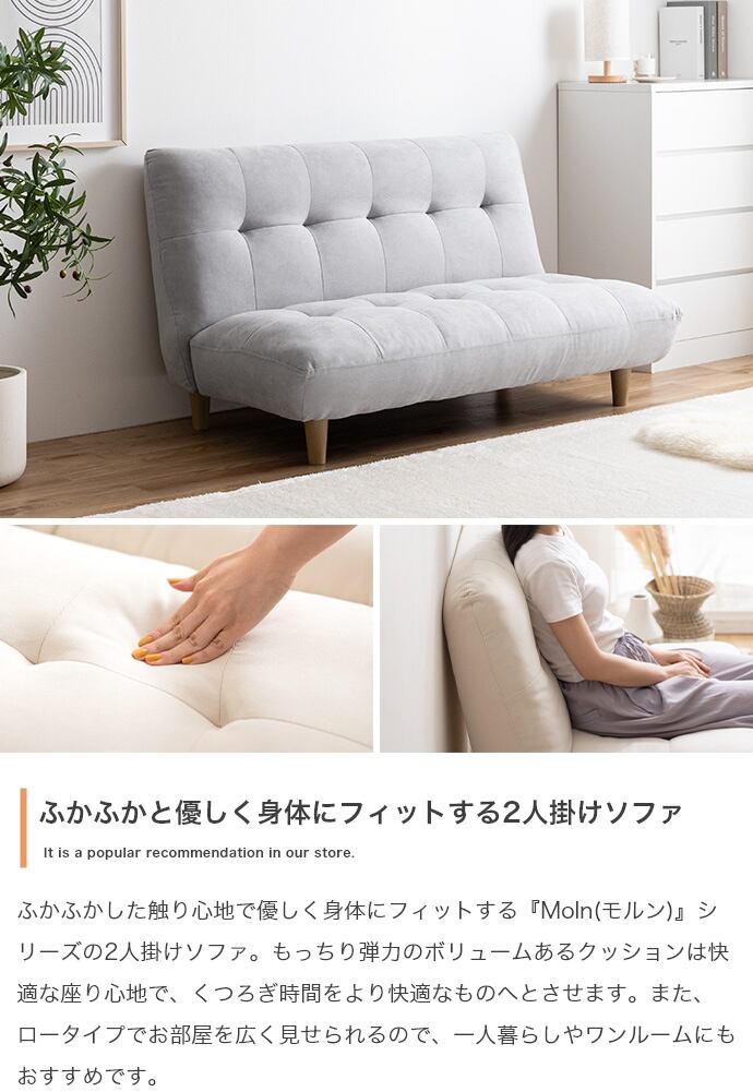 ふわふわもっちり感が可愛い『Moln(モルン)』の二人掛けソファ。もっちり弾力のボリュームあるクッションは快適な座り心地で、くつろぎ時間をより快適なものへとさせます。一人暮らしやワンルームでも置きやすいコンパクトサイズで、脚部を取り外せばローソファにもなりお部屋を広く見せることが可能です。また、ひじ掛けの無いアームレスタイプなので横になってくつろぐことも。