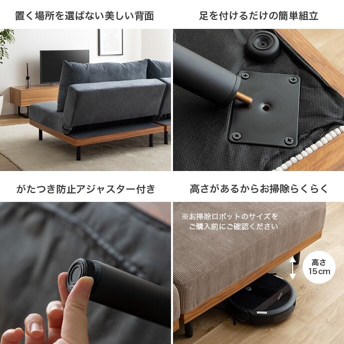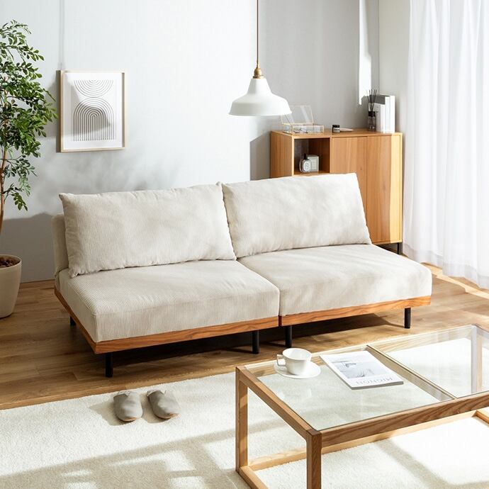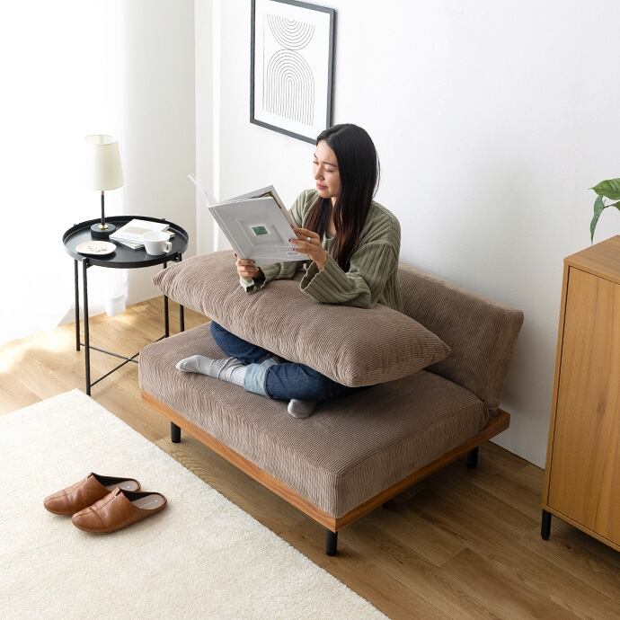 コーデュロイ×木目柄×アイアンの異素材MIXが味わい深い『Ridley(リドリー)』リクライニングソファ。コーデュロイの優しい肌触りと心地よい弾力のクッション、楽な姿勢に調整できる3段階リクライニングで、快適なくつろぎタイムを叶えます。脚も取り外せるロー設計なので圧迫感が少なく、ワンルームなどのスペースに余裕のないお部屋にもピッタリ。また、2脚揃えるとソファベッドになり、友人や家族が泊まりに来た時用の簡易ベッドや、足をのばしてくつろぐカウチソファとしても大活躍します。