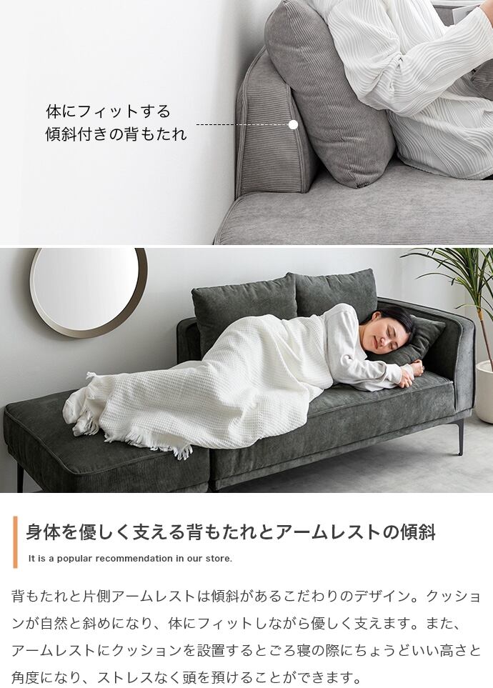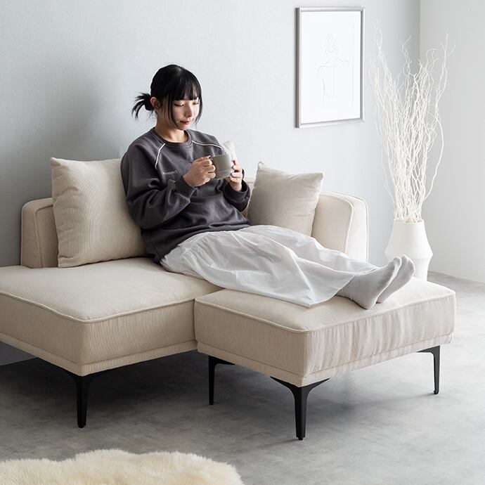 上品な光沢のコーデュロイとアイアン脚の組み合わせが美しい『Siena(シエナ)』オットマン付き2人掛けカウチソファ。ゆったりくつろげるゆとりのある広々座面と、片側アームレスト仕様で快適なリラックスタイムを実現。セットのオットマンを組み合わせることで、お部屋の間取りやシーンに合わて柔軟にレイアウトを変更できます。また、脚も取り外せるロー設計のため圧迫感が少なく、ワンルームなどのスペースに余裕のないお部屋にもピッタリです。