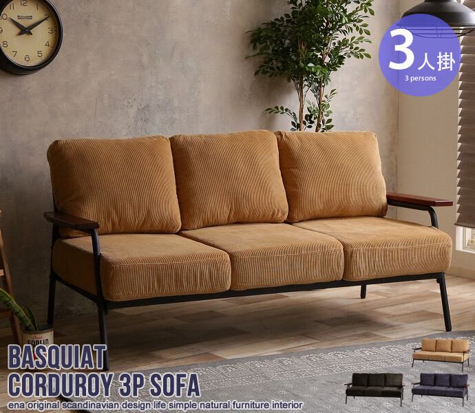 コーデュロイとブラックスチールのフレームと天然木の肘置きを組み合わせた優しい雰囲気の『Basquiat corduroy』3人掛けソファ。暖かみのあるコーデュロイが特徴的で、どんなインテリアにも合わせやすいデザインとなっております。カラーは、イエローとグリーンとネイビーの3色をご用意。お部屋に合わせてお選びください。