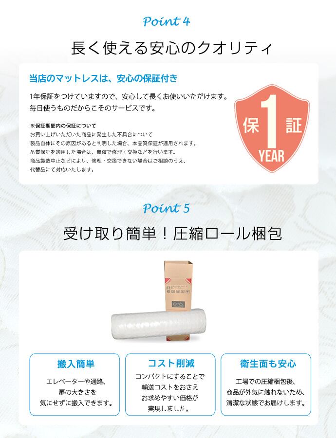 耐久性に優れた高弾力のコイルスプリングを使用し、厚さ約15cmのボリューム感を実現。身体を面で支えるので、安定感があって快適な眠りをサポートします。通気性に優れ、1年中気持ち良くお使いいただけます。お届けの際は、圧縮ロール状態なので、エレベーターや通路、扉の大きさを気にせずに受け取りができます。【ダブル】