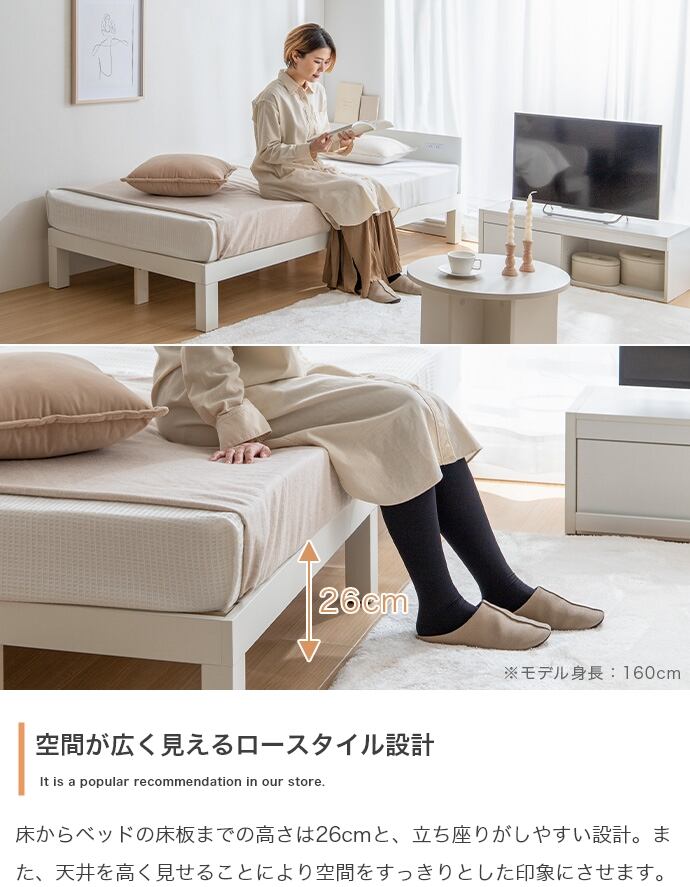 シンプルなデザインに便利さを込めたすのこベッド『Ruhe(ルーエ)』。無駄な装飾を除いた薄型のヘッドボードには棚スペースや2口コンセントを搭載。床板には通気性抜群のすのこを採用し、美しさと機能性が1台にぎゅっと詰まった快適ベッドです。