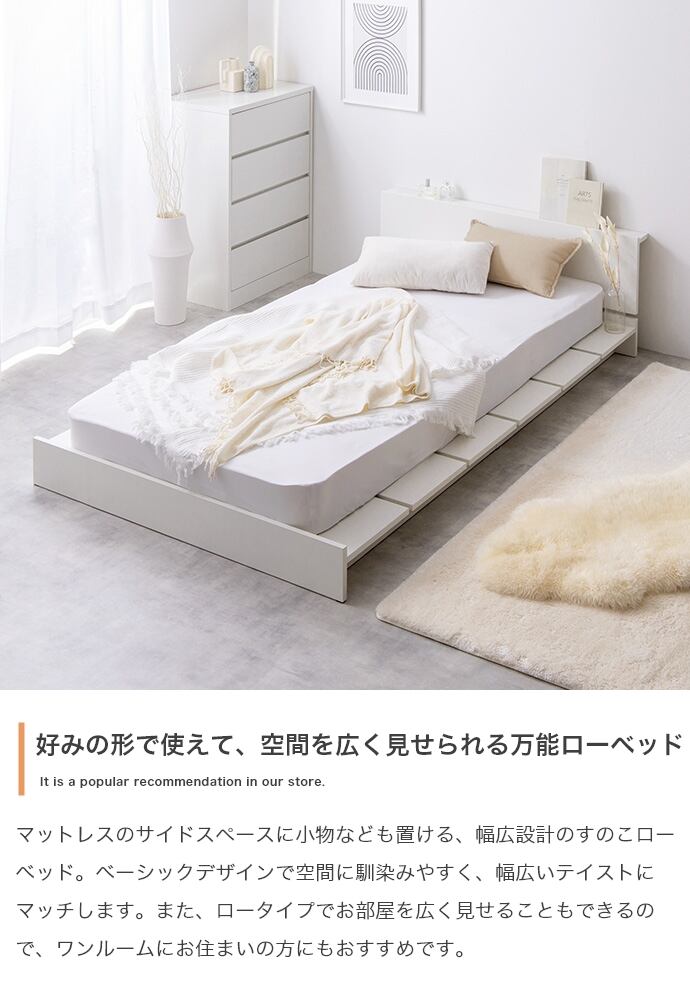 好きなスタイルで使えて、人気のロースタイルのお部屋も作れる『Yuseong(ユソン)』幅広すのこローベッド。マットレスのサイドにはスペースができる幅広設計で、小物や本などを置いていただけます。また、ロータイプで空間を広く見せることができるので、ワンルームやスペースに余裕のないお部屋にお住まいの方にもおすすめです。