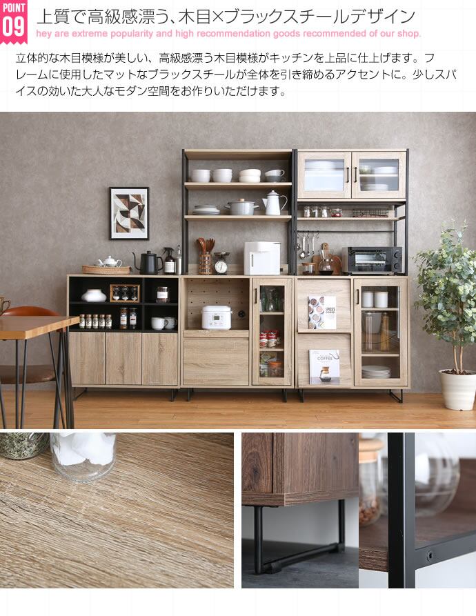 1台で食器や調理家電をまとめて収納できるオープン棚・ガラス扉・スライドトレー付き食器棚です。