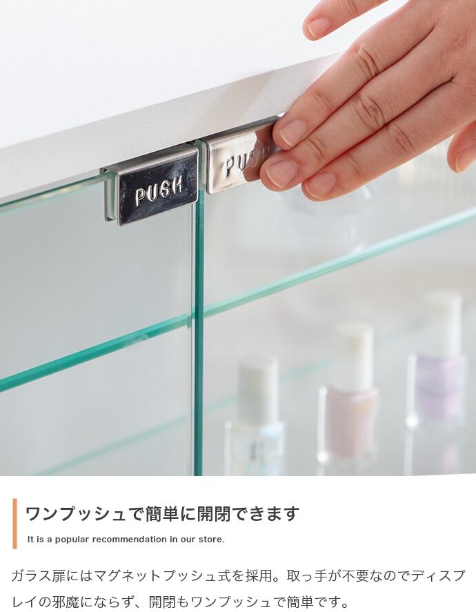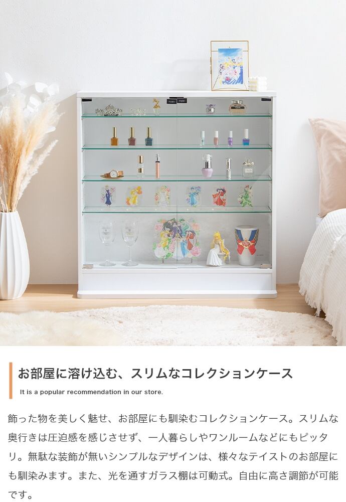 コレクションを美しく魅せて、お部屋にも馴染むコレクションケース『Legen(レーゲン)』。スリムな奥行きは圧迫感を感じさせず、一人暮らしやワンルームなどにもピッタリ。無駄な装飾が無いシンプルなデザインは、様々なテイストのお部屋にも馴染みます。また、光を通すガラス棚は可動式。コレクションに合わせて自由に高さ調節が可能です。