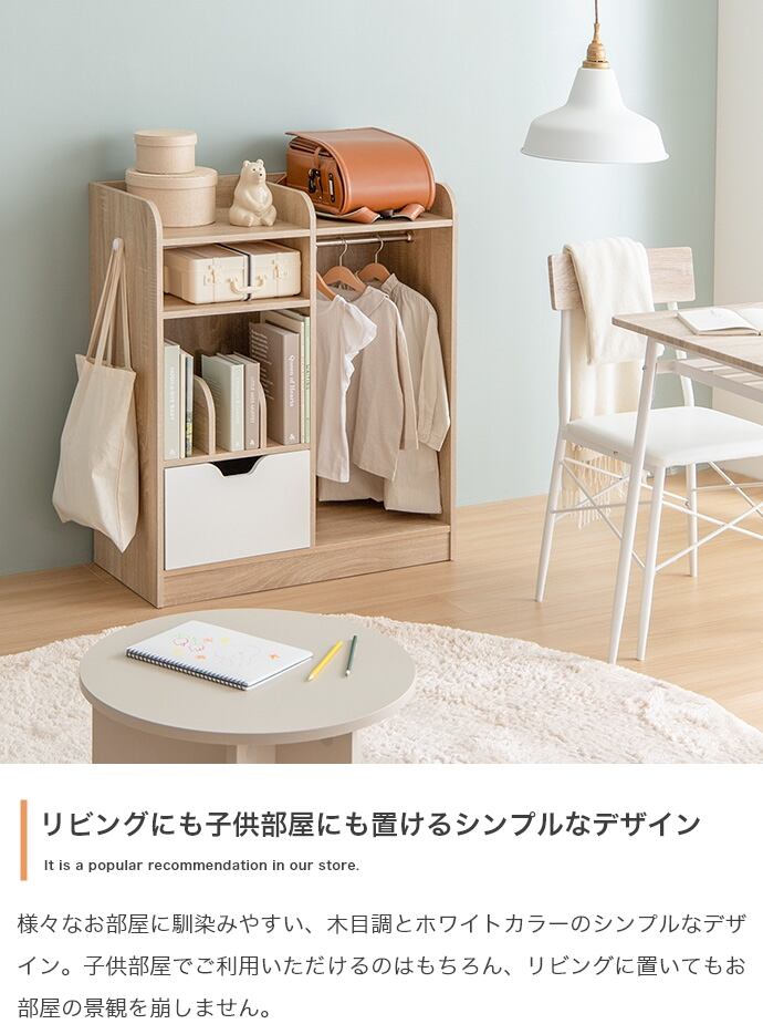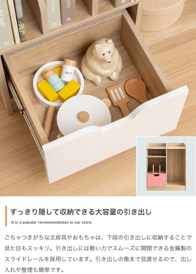 お子様の片づけやすさにこだわった『Pila(ピラ)』マルチ収納付きランドセルラック。ランドセルを置ける天板・オープン収納・本棚・引き出し・ワードローブを備え、お子様の衣類から学用品まで一か所に纏めて収納することができます。収納スペースのエリアを小分けに区切ることで片付けがしやすく、よく使うものをサッと出し入れ可能。シンプルでインテリアにも馴染みやすく、飽きのこない長く使えるデザインです。