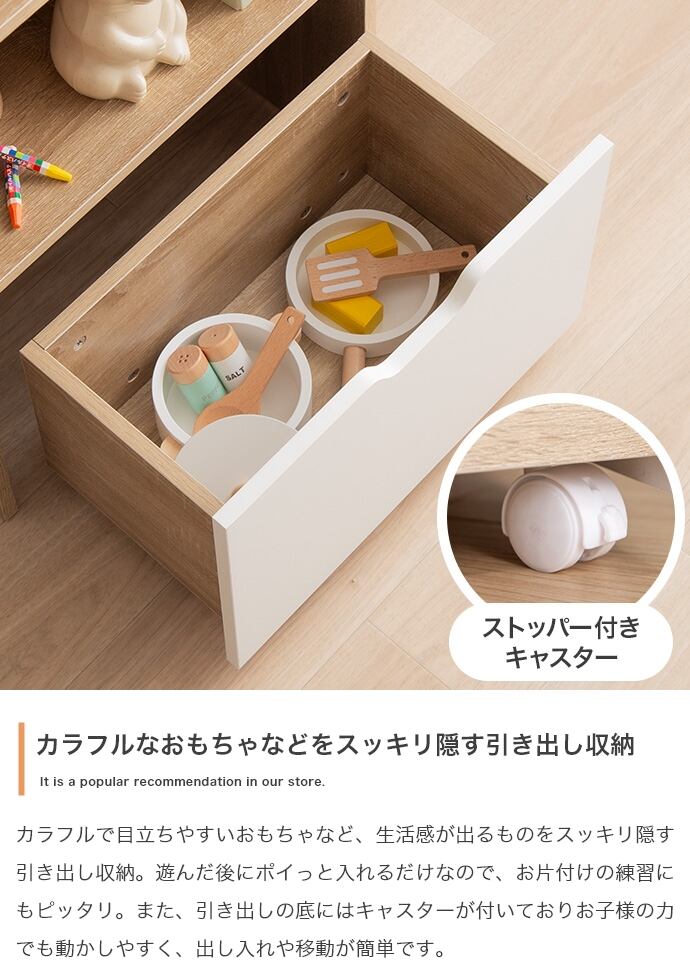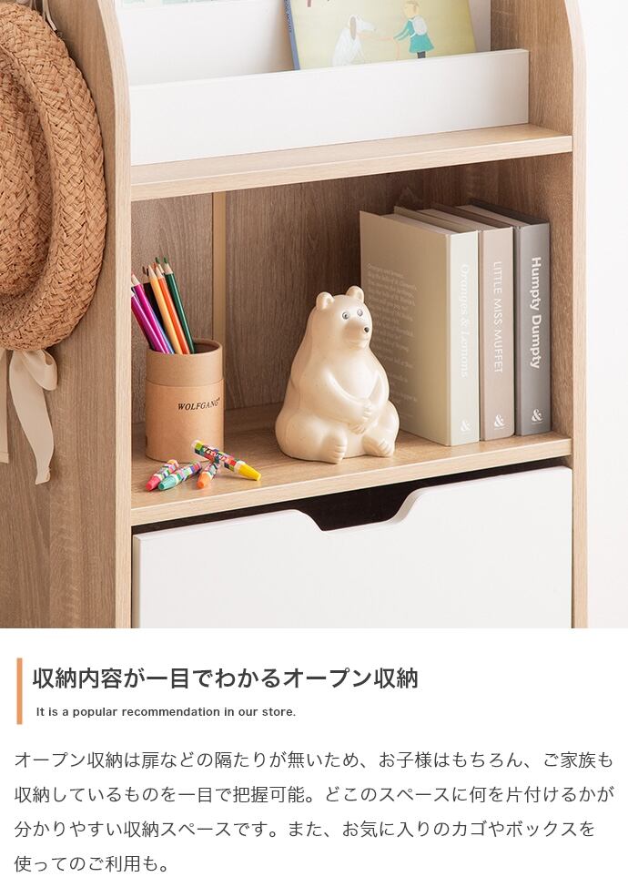 【耐荷重】絵本棚:約20kg、オープン収納底板:約30kg、引き出し:約20kg、フック:約10kg