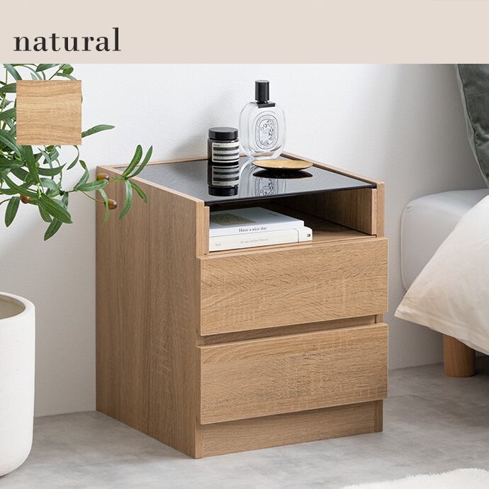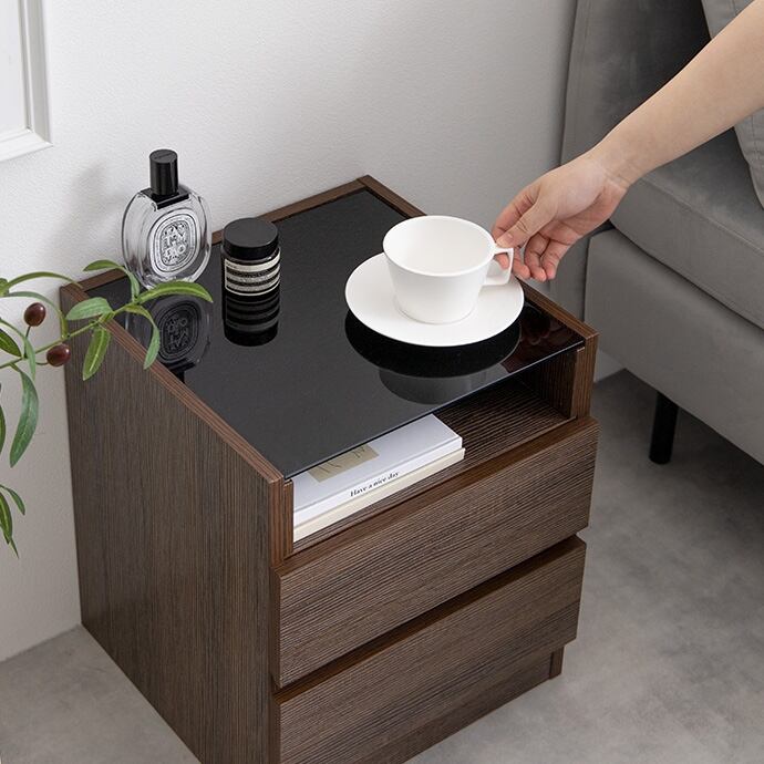 できる限り凹凸を無くしたフラットな外観が、スタイリッシュで美しい『Connie(コニー)』ナイトテーブル。相性の良い美しい木目調とブラックガラス天板の組み合わせは、モダンで高級感漂う空間を演出します。天板下にはオープン収納と引き出し収納を備えており、収納力も抜群。さらに、ブラックガラス天板と引き出し収納でお部屋をすっきり見せることが可能です。また、幅35cmとコンパクトなサイズは省スペースで置けるので、ベッドやソファサイド、ワンルームなど限られたスペースにもすっきり置いていただけます。