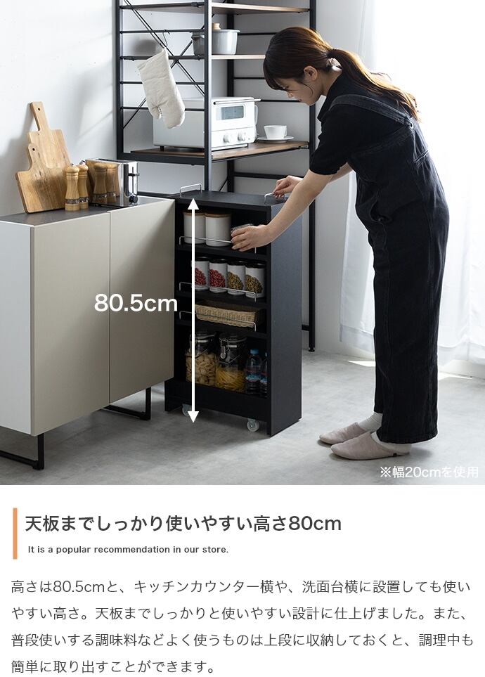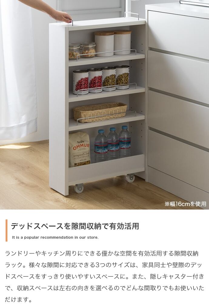デッドスペースを有効活用できる『Tumsae(トゥムセ)』幅10cm隙間収納ラック。ランドリーやキッチン周りでできる僅かな隙間にぴったりフィットし、見た目もすっきりと使いやすいスペースに。様々な場所で大活躍できるよう3つの幅をご用意しているので、使いたい場所に合わせてお選びただけます。隠しキャスター付きで、収納スペースは左右の向きを選べるので、どんな間取りでもお使いいただくことが可能です。