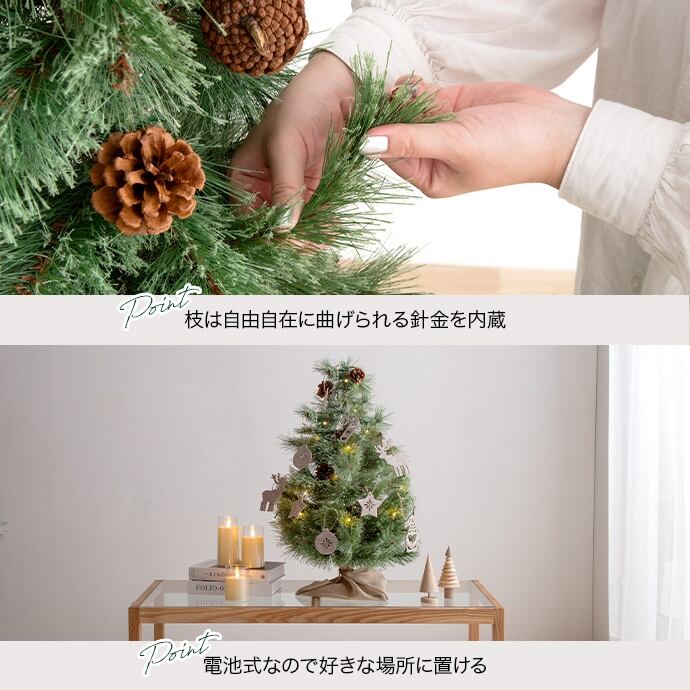 ホリデーシーズンを彩り、クリスマスムードをさらに盛り上げる『Chalon(カロン)』シリーズのクリスマスツリー。細部までもみの木のリアルな質感を再現し、高級感と上質感を醸し出します。ボリュームたっぷりで贅沢な見栄えの枝葉は、葉が抜けにくく長く綺麗にお使いいただけます。幻想的な雰囲気を楽しめるLEDライトと、本物の松ぼっくりが付属。LEDライトは電池式なので、お好みの場所にツリーを置くことができるのが魅力です。