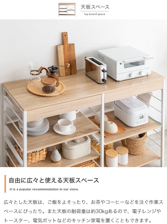 【耐荷重】天板:約30kg、各引き出し:約5kg、各棚:約10kg、スライドトレー:約5kg