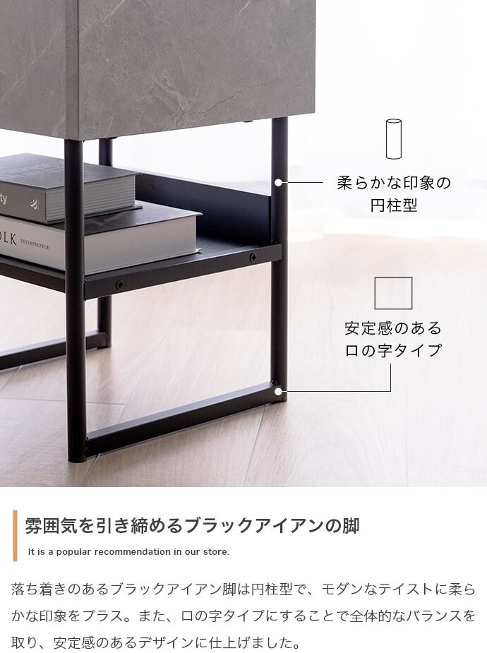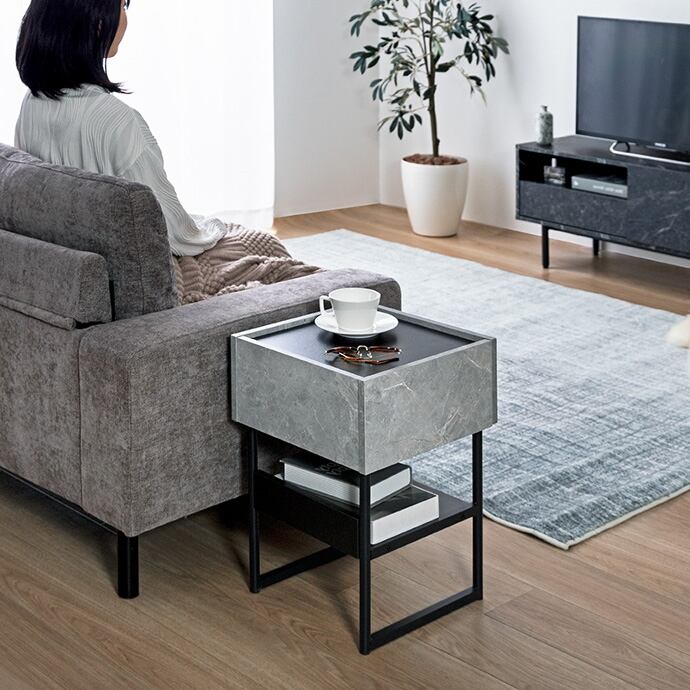大人モダンな雰囲気が特徴の『Zele(ゼル)』サイドテーブル。直線的でシンプルな見た目ながら、引き出しとオープン棚付きでデザイン性だけでなく機能面にもこだわりました。背面も美しい仕上がりになっているので、お部屋のお好きな位置に設置可能です。ソファ横で飲み物やスマホなどを置いたり、ベッド横で時計や眼鏡を置く宮棚の代わりにしたり、様々なシーンで活用できます。
