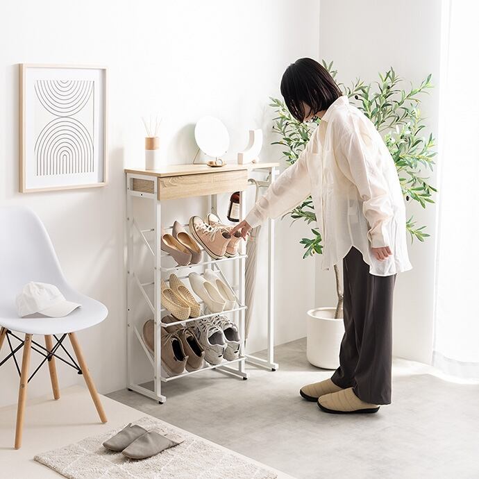 玄関収納を一つにまとめた『Tito(ティート)』シリーズの傘立て・引き出し付きシューズラック。奥行27cmとスリムで狭い玄関でも場所をとりません。オープン仕様なので通気性が良く、棚板がないのでゴミがたまりづらい設計です。また、傘や靴ベラをかけられるバーは引っ掛けるだけなので手間になりません。天板下の引き出しには、鍵やマスクなどの小物類を隠して収納ができスッキリした印象を与えることができます。一人暮らしやワンルームなど狭い玄関にお困りな方におすすめの商品です。