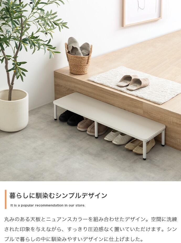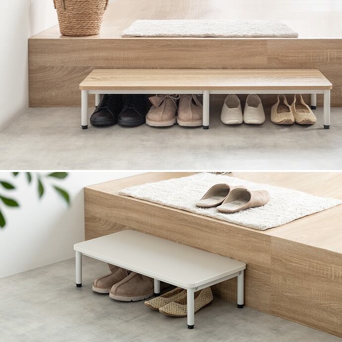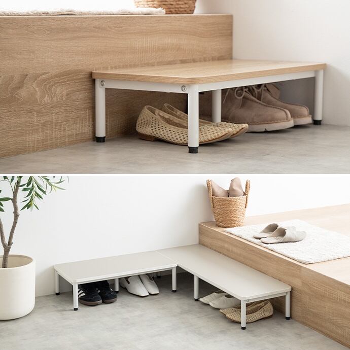 シューズ収納、ステップ台の1台2役で使える『Palam(パラム)』1段シューズラック。高さ約16cmで、玄関の段差を緩和し足腰への負担を軽減します。小さなお子様やご年配の方の昇降サポートにぴったり。また座りながら靴の脱ぎ履きが行えるだけでなく、脱いだ靴はそのまま台の下に収納可能。家族みんなが快適に使える玄関を実現します。