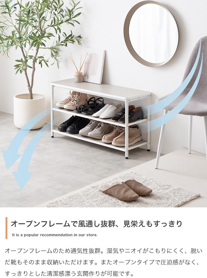 シューズ収納、ベンチの1台2役で使える『Palam(パラム)』3段シューズラック。天板は耐荷重約60kgとしっかりした作りで、ベンチのように座りながら靴の脱ぎ履きが可能。また天板下には2段の収納スペースを設けており、靴はもちろん雑貨のディスプレイにも最適です。スリム設計でスペースのない玄関先にも設置でき、玄関を快適でより素敵な空間にしてくれます。