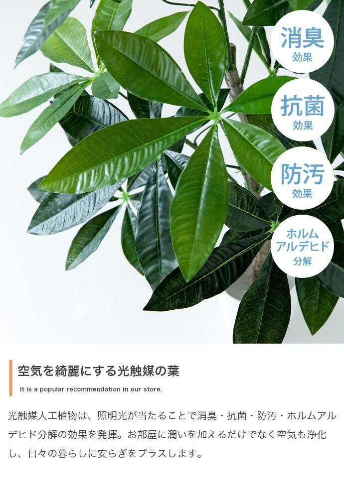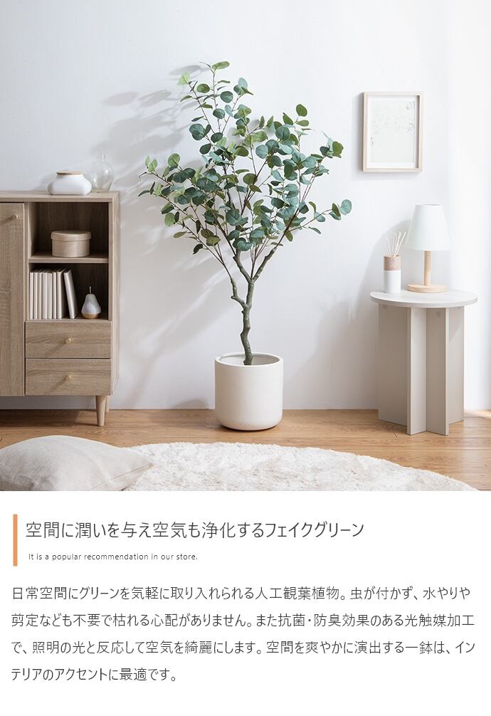 日常空間にグリーンを気軽に取り入れられる、光触媒人工観葉植物『Nature(ナチュレ)』シリーズのユーカリ。光触媒人工観葉植物は、照明光が当たることで消臭・抗菌・防汚・ホルムアルデヒド分解の効果を発揮します。人工物でメンテナンスも簡単な観葉植物は、手軽に取り入れやすいのが魅力。面倒な水やりや剪定が不要なので、忙しくてなかなか植物のお世話ができない方にもおすすめです。また、ディテールにこだわり、葉や実の色付きから枝付きまで自然な風合いを再現。お部屋のインテリアに馴染むように細部まで丁寧に作り上げています。