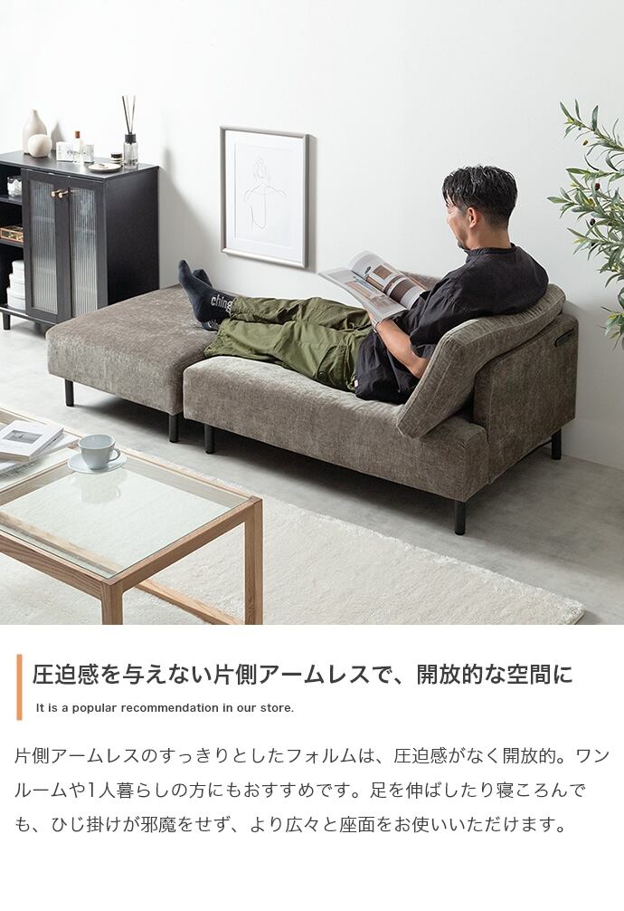 ゆったりくつろげる『Cody(コーディ)』コンセント・オットマン付き2人掛けソファ。座面は幅も奥行もワイドに。ごろごろと寝転がれるほどの広さ設計にしました。ソファとオットマンの2点セットで、お部屋やお好みの形に合わせて自由にレイアウトしていただけます。また、ひじ掛けが邪魔にならない片側アームレスタイプ。男性が横なっても窮屈に感じることなく快適にお過ごしいただけます。