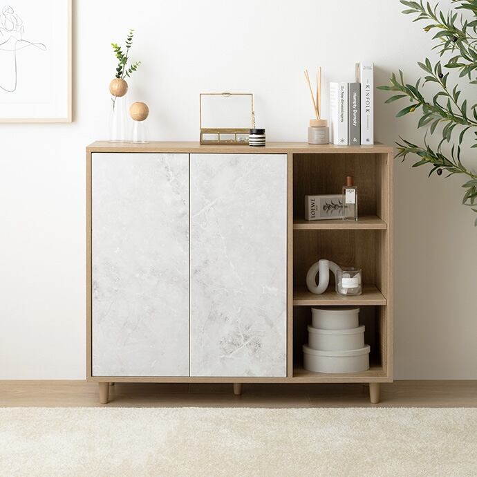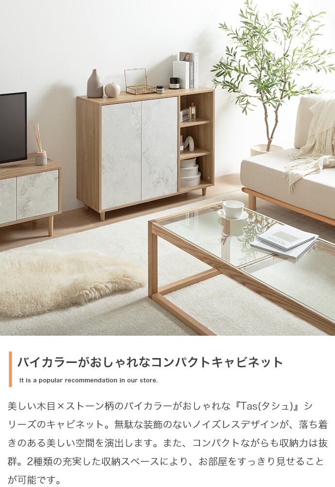 美しい木目×ストーン柄のバイカラーデザインがおしゃれな『Tas(タシュ)』シリーズのキャビネット。無駄な装飾を省いたノイズレスデザインが、落ち着きのある美しい空間を演出します。また、奥行31cmとスリム設計ながら大容量の収納スペースがあり、お部屋の小物をまとめて収納可能。リビングやキッチンなどの限られたスペースにもすっきり置いていただける、デザイン性と実用性を兼ね備えたキャビネットです。