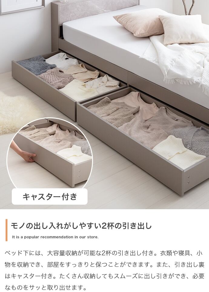 ストーン柄が高級感漂う『Raffine(ラフィネ)』宮棚&コンセント付き引き出し収納ベッド。ヘッドボードに施されたストーン柄のアクセントが、お部屋を洗練された空間に導きます。またベッド下には大容量の引き出しが2杯付属。スペースを有効活用できるため、すっきりとした美しい空間を演出します。