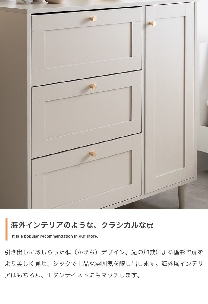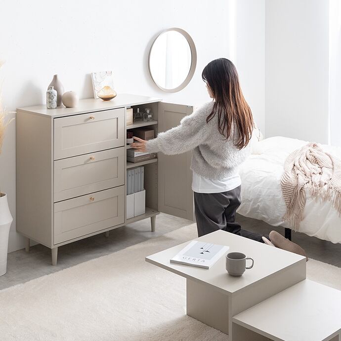品のある框(かまち)デザインと柔らかなニュアンスカラーが印象的な『Calan(カラン)』シリーズのキャビネット。シャンパンゴールドの取っ手と美しい框デザインがお部屋のアクセントとなり、感度の高い海外インテリアのような空間へと導きます。柔らかなニュアンスカラーで甘すぎない大人な可愛さもプラスし、置くだけでお部屋をセンスアップさせることが可能です。