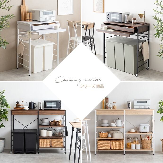 ゴミ箱上のデッドスペースを収納・作業スペースとして有効的に活用する『Cammy(キャミー)』ゴミ箱上レンジラック。ワイドな引き出しとちょい置きできるスライドトレーは、手狭なキッチンをすっきり整理し快適に。また、天板には2口コンセントが付いており、キッチン家電を置くことも可能です。アジャスターとキャスターの部品がどちらも付属しているため、固定も移動もお選びいただけ、用途に合わせてお好きなスタイルでお使いいただけます。