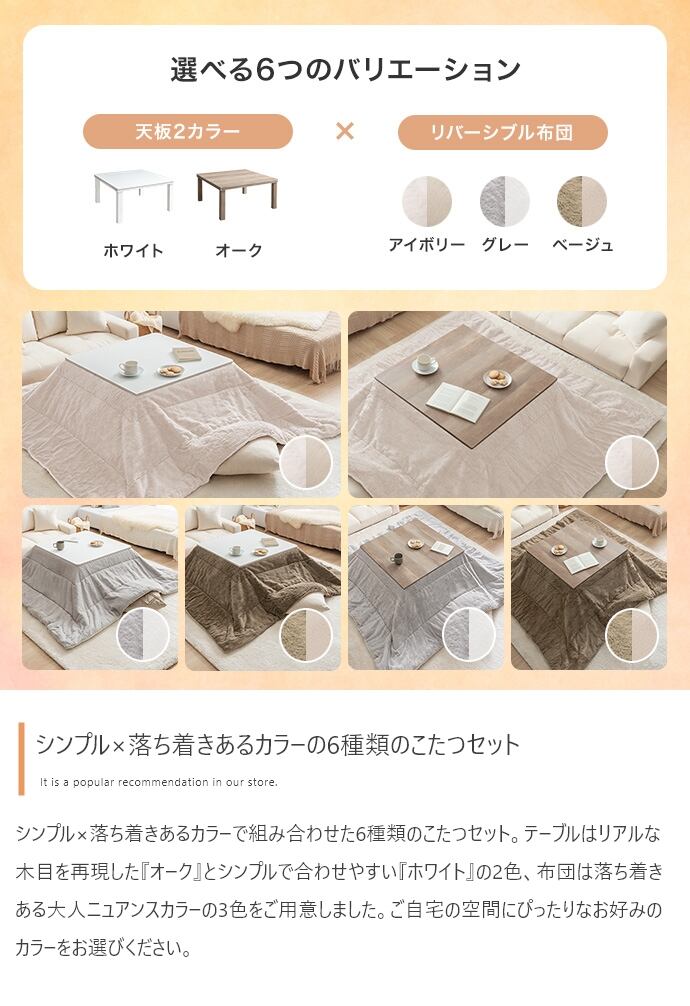 お部屋馴染みのいいナチュラルカラーのこたつテーブルと、思わず頬ずりしたくなるような肌触りのこたつ布団を組み合わせたこたつ2点セット。コンパクト&薄手生地なので、省スペースで置きたい方におすすめです。また、布団はファーとフランネルのリバーシブル仕様になっているので、気分や雰囲気に合わせて印象を変えて、温もりある空間作りをお楽しみください。