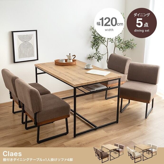 【5点セット】Claes 幅120cm 棚付きダイニングテーブル+1人掛けソファ4脚