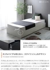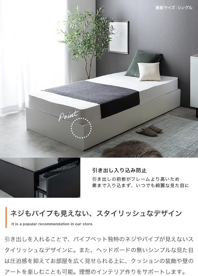 スタイリッシュな美しさとパイプの耐久性を兼ね備えた『Stock(ストック)』引出し収納ベッド。外側はネジやパイプが見えない美しいデザインで、内部は耐久性に優れたパイプ構造。通気性の良いメッシュ仕様の引き出し2杯付きで、お部屋をすっきり整理できます。