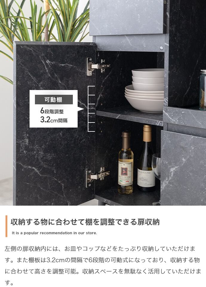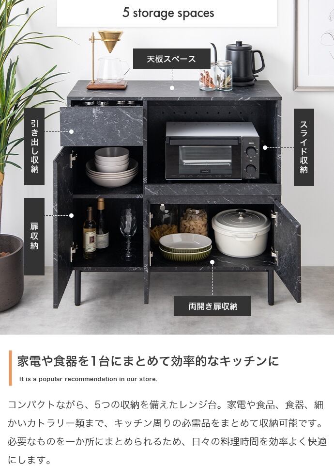 大理石柄の美しさが際立つ『Ellis(エリス)』シリーズのレンジ台。直線的なフラットデザインで、置くだけで落ち着いた大人な空間を演出します。また5種類の収納を備えており、家電や細かい調理道具をまとめて収納可能。使いたいものがすぐ取り出せるため、毎日の「使いやすい」を叶えます。デザインも使い勝手も抜群の、洗練されたレンジ台です。