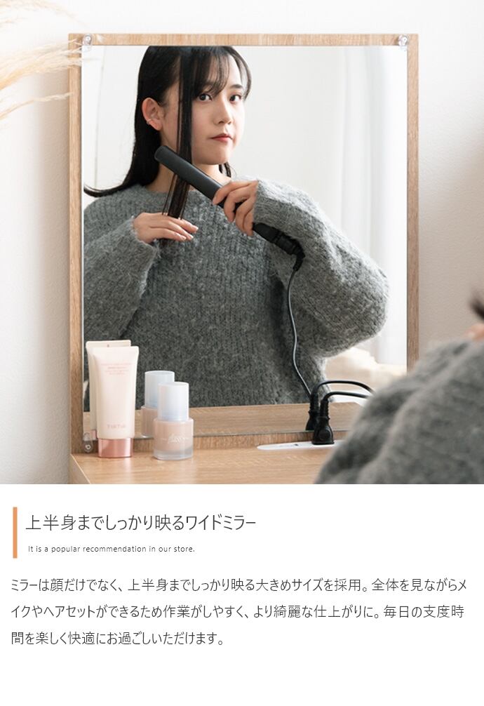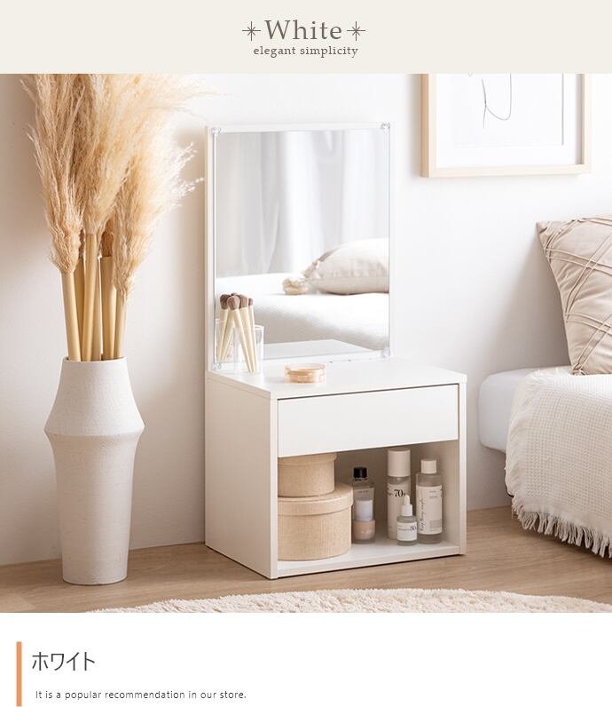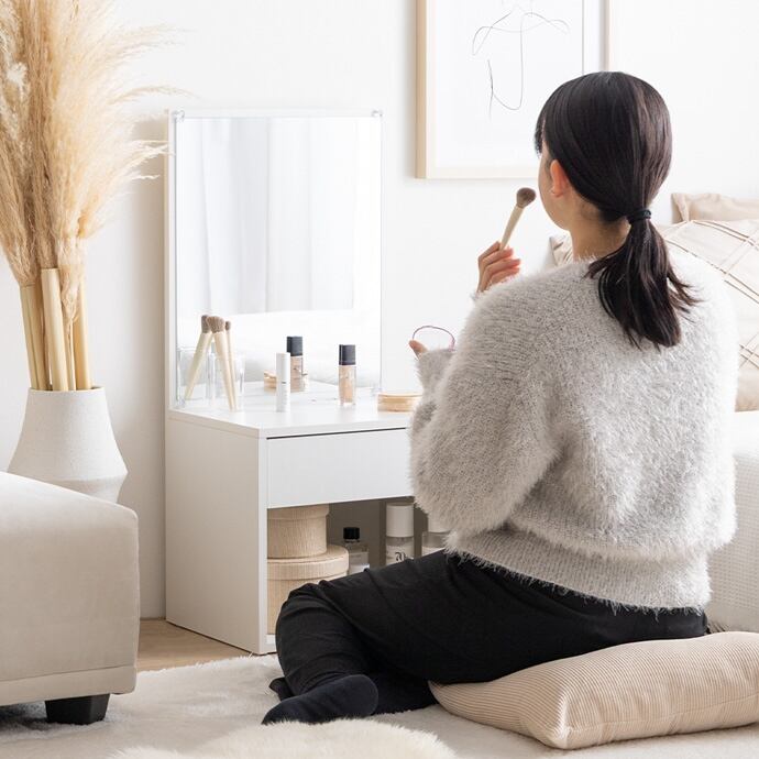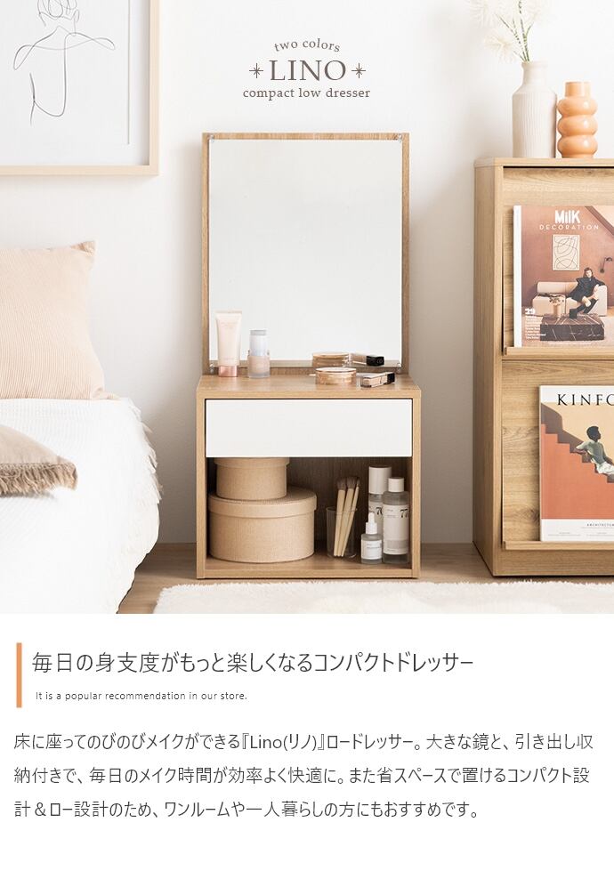 床に座ってのびのびメイクができる『Lino(リノ)』ロードレッサー。大きな鏡と引き出し収納付きで、毎日のメイク時間が効率よく快適に。省スペースで置けるコンパクト設計&ロー設計のため、ワンルームや一人暮らしの方にもおすすめです。また無駄な装飾のないノイズレスなデザインは、空間をすっきりと見せ、洗練された雰囲気を演出。シンプルで飽きが来ないため、長くご使用いただけます。