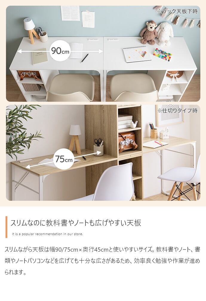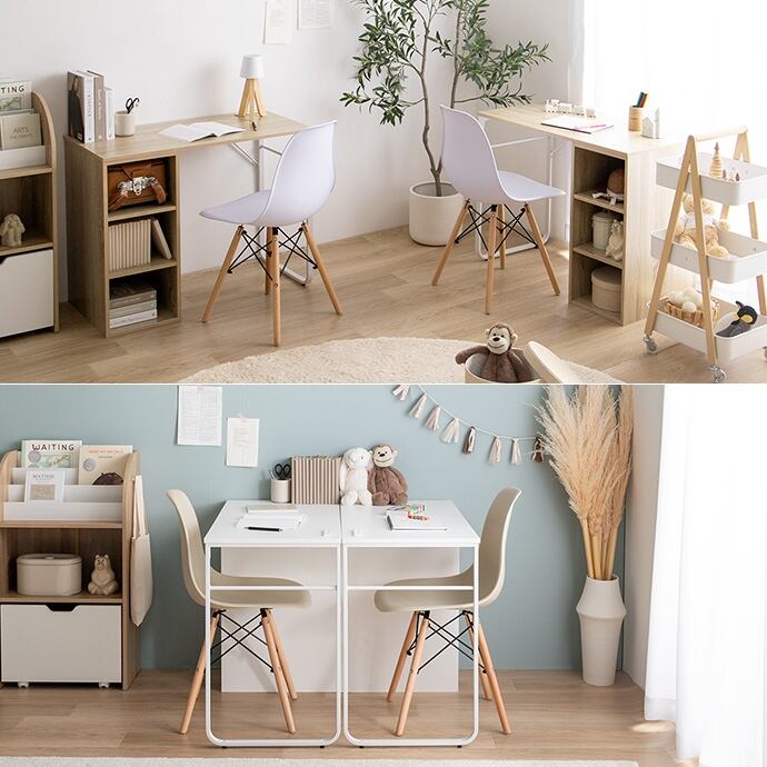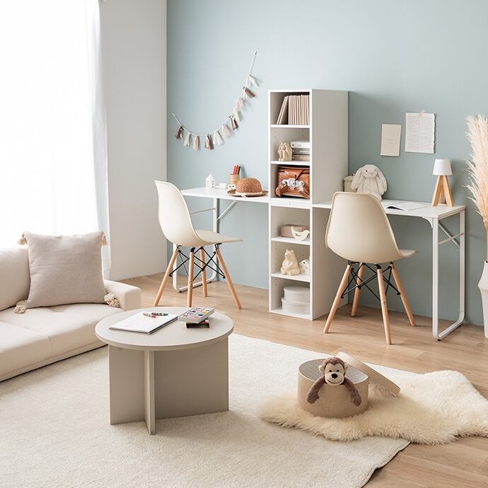ライフスタイルに合わせてレイアウトを自由に変更できるツインデスクセット。スリムなサイズ感で、子ども部屋やリビングにもすっきり収まります。ランドセルまで収納できるラックや広々とした天板で、使い勝手も抜群。シンプルで洗練されたデザインのため、大人になっても長く愛用できます。