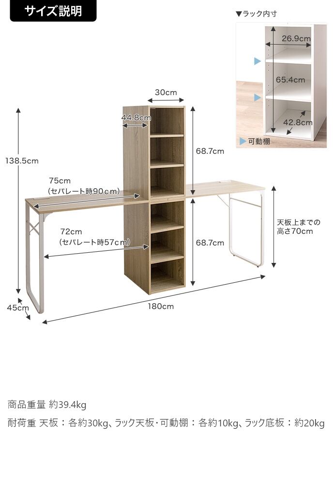 〇重量:【商品重量】約39.4kg 【耐荷重】各デスク天板:約30kg、各ラック天板・可動棚:約10kg、各ラック底板:約20kg