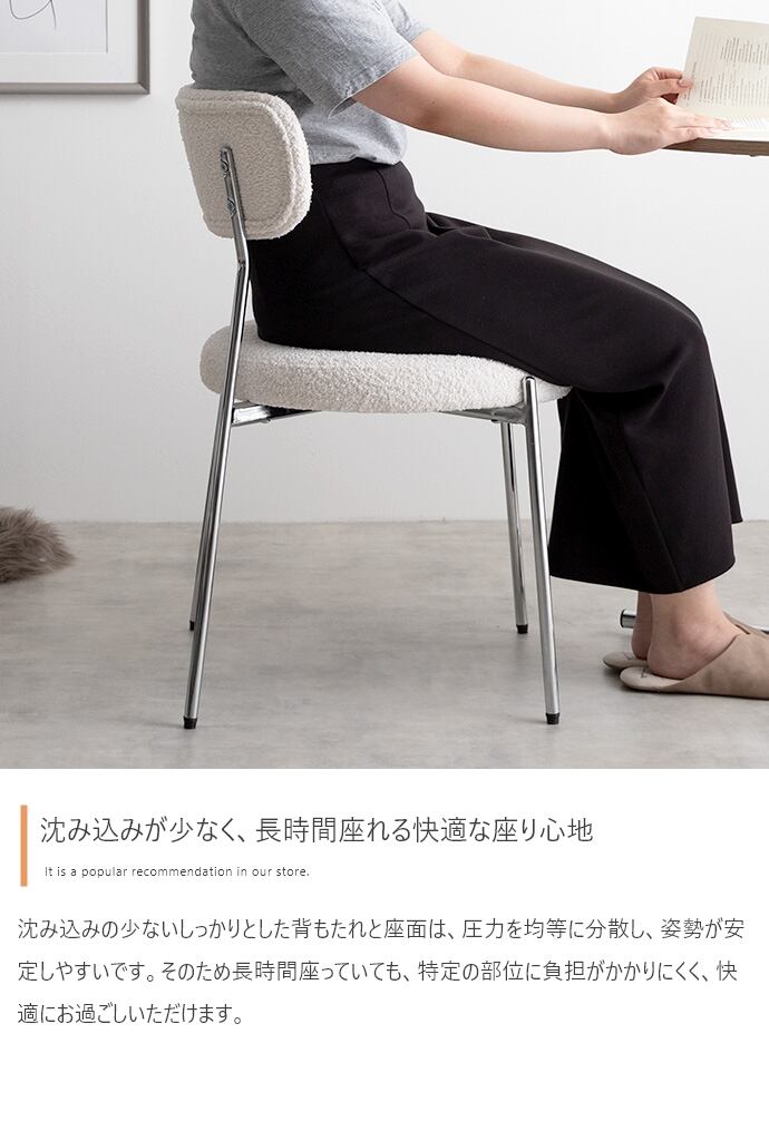ダイニングスペースを特別な空間へと導くダイニングチェア。モコモコ生地×シルバー脚のデザインは、モダンで大人な雰囲気を醸し出します。またカーブの利いた背もたれや沈み込みの少ない広めの座面で、座り心地も抜群です。一味違った空間で快適な食事時間をお楽しみください。