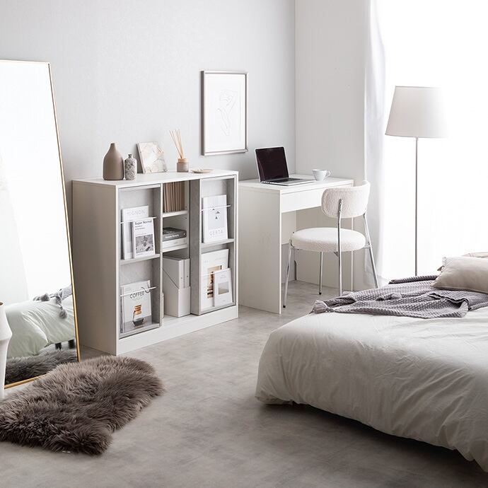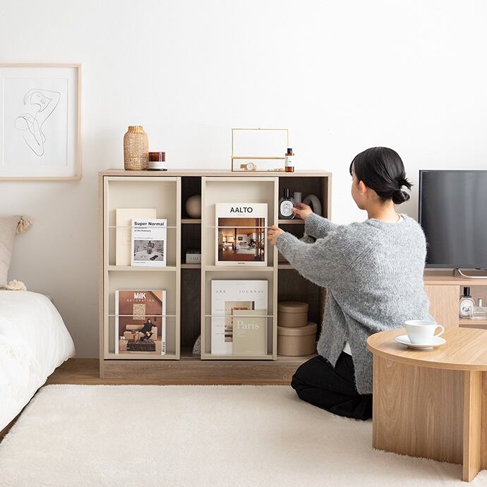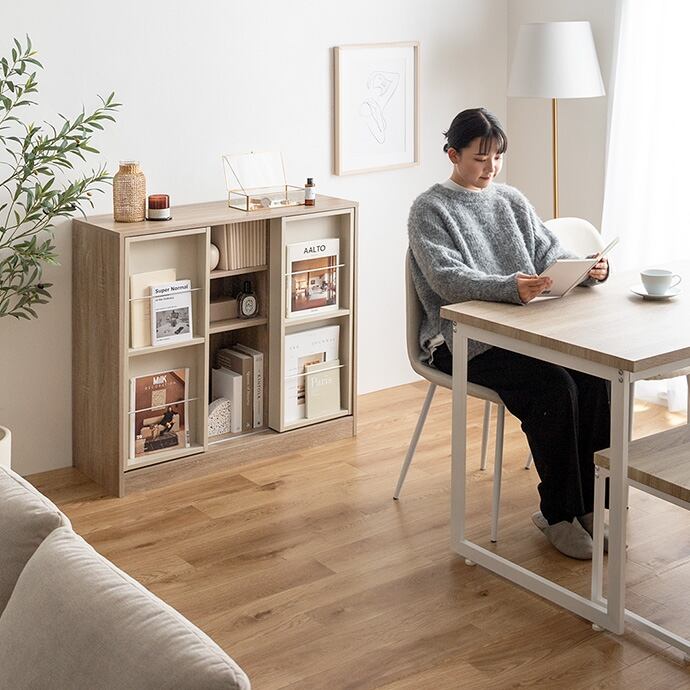 左右に動かすスライド棚で「隠す」と「見せる」が両立できる『Mysa(ミーサ)』スライド収納付き本棚ラック。カラーはぬくもりが感じられるナチュラルと洗練された印象を与えるホワイトの2色をご用意しました。ポイントのスライド棚は生活感の出る物が隠せて、お部屋をすっきり見せることができます。また本や雑誌をディスプレイすることで自分だけのおしゃれな空間に。さらに大容量収納で物が多い方でもたっぷり収納していただけます。大容量収納なのに、スリム設計のためワンルームや一人暮らしの方にもおすすめです。