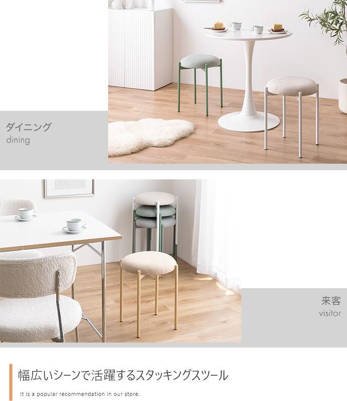 ラウンド型で座面と脚部の配色にこだわった『Mael(マエル)』スタッキングスツール。すっきりバランスのいいフォルムが上質な印象を空間に与えます。またダイニングやドレッサーなど幅広いシーンで使用可能。程よいクッション性で長時間座っていても疲れにくく、座り心地も快適です。さらにかさばらないコンパクトサイズで、一人暮らしの方にもおすすめ。スタッキングもできるため、使わない時は省スペースで保管でき便利です。